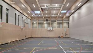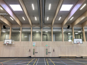 Dabei sind EKL Sportleuchten technisch auf Zack; liefern je Leuchte blendfreie 8.574 lm Lichtleistung in angenehm heller Lichtfarbe bei 4000 Kelvin. Die top gleichmäßig ausgeleuchtete 3-Feldhalle erreicht eine mittlere Beleuchtungsstärke von 596 lux; liegt damit zum Wohl aller Nutzer über Norm, die laut Beleuchtungsklasse II der EN 12193 500 lux vorgibt. Mit 77 Watt Anschlussleistung wird der eigens von der Schule über Photovoltaik generierte Strom nur wenig in Anspruch genommen.
