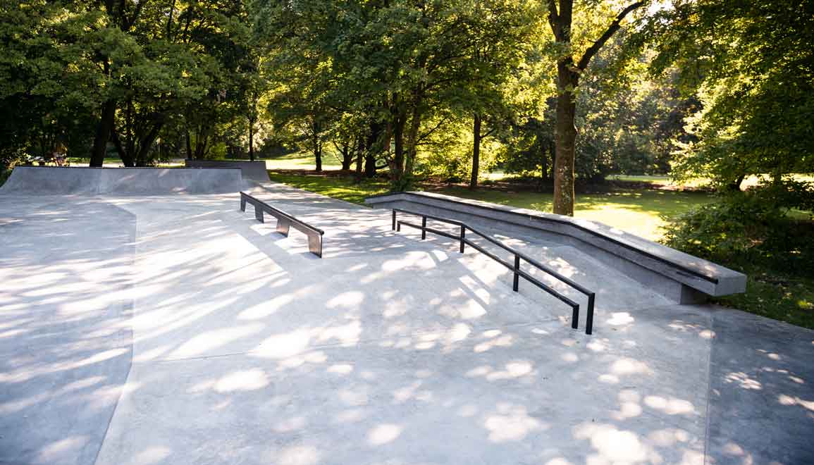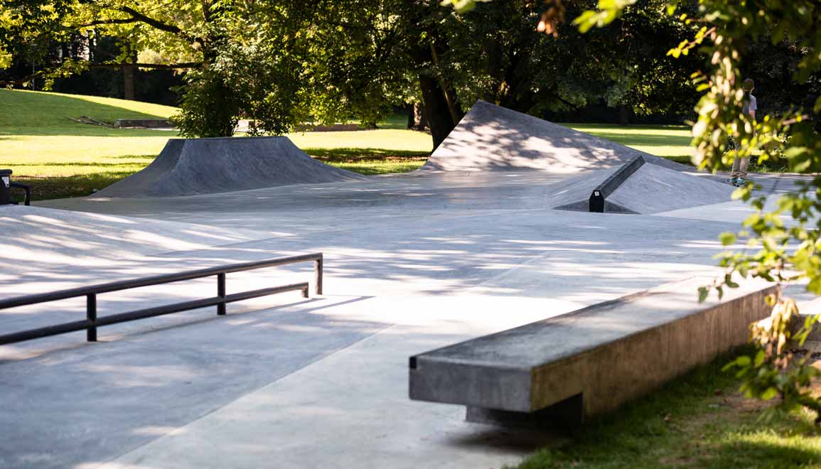 In enger Abstimmung mit der Stadtverwaltung und der Beteiligungsgruppe flossen die lokalen Wünsche, Anforderungen und Nutzungsvorstellungen kontinuierlich in die Planung ein. Ein zentrales Anliegen aller Beteiligten war es, die Einzigartigkeit der Anlage über eine hohe gestalterische Qualität zu definieren. Da Skateparks keine normierten Sportanlagen sind, eröffnet sich ein besonders großer gestalterischer Spielraum, der für dieses Projekt bewusst ausgeschöpft werden sollte. Ausgehend vom Design-Leitsatz „Form follows Function“ entstand auf einer Nettofläche von rund 600 m² ein öffentlicher Street-Skatepark, der den Anspruch verfolgt, einerseits ästhetisch eigenständig und neuartig zu sein, andererseits jedoch den funktionalen Anforderungen der Rollsportler:innen in vollem Umfang gerecht zu werden. Die aus Ortbeton modellierten Elemente erhielten einen skulpturalen Charakter, der der Anlage ein unverwechselbares Erscheinungsbild verleiht und zugleich funktional wirkt. Freistehende, teilweise freischwebende Elemente sorgen für eine hohe Blickdurchlässigkeit und ermöglichen vielfältige Sichtachsen. Diese Gestaltung unterstützt die gewünschte soziale Kontrolle und trägt dazu bei, den Skatepark als „sicheren Ort“ innerhalb des weitläufigen Hirschgartens zu etablieren.